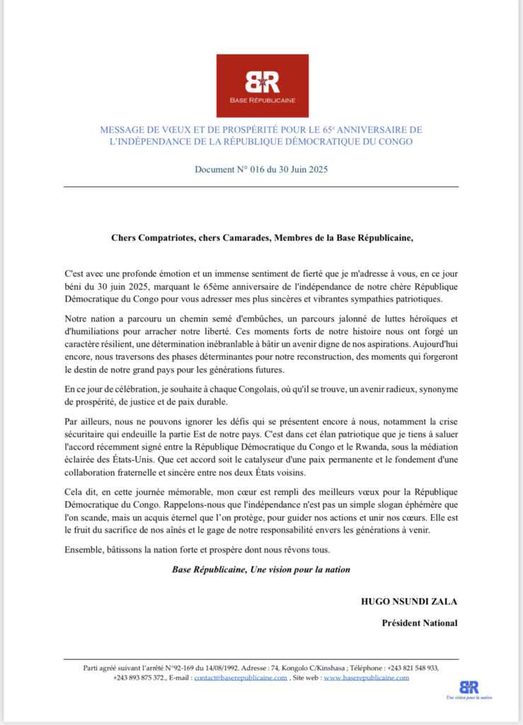 MESSAGE DE VŒUX ET DE PROSPÉRITÉ POUR LE 65e ANNIVERSAIRE DE L’INDÉPENDANCE DE LA RÉPUBLIQUE DÉMOCRATIQUE DU CONGO